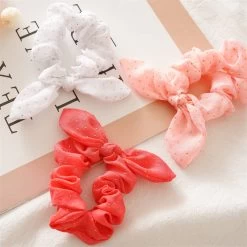 The chiffon fabric of these scrunchies adds a touch of style, while the stretchable rubber inner band ensures a secure and comfortable fit. The pack includes three colour options: white, pink, and watermelon.