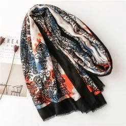 Designed with a perfect blend of 50% viscose and 50% polyester, our Black orange tie-dye floral prints fringed scarf measures 180cm long by 90cm wide. This ideal mix makes it suitable for all seasons, providing both comfort and style year-round.