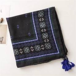 Be the first to review “Black Royal Blue Geometric Prints Square Scarf With Beads Tassels” Cancel reply