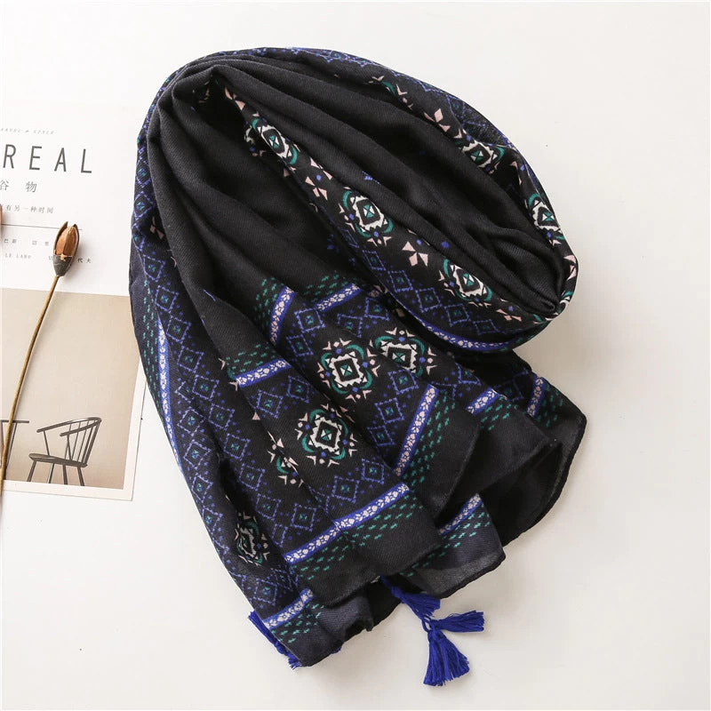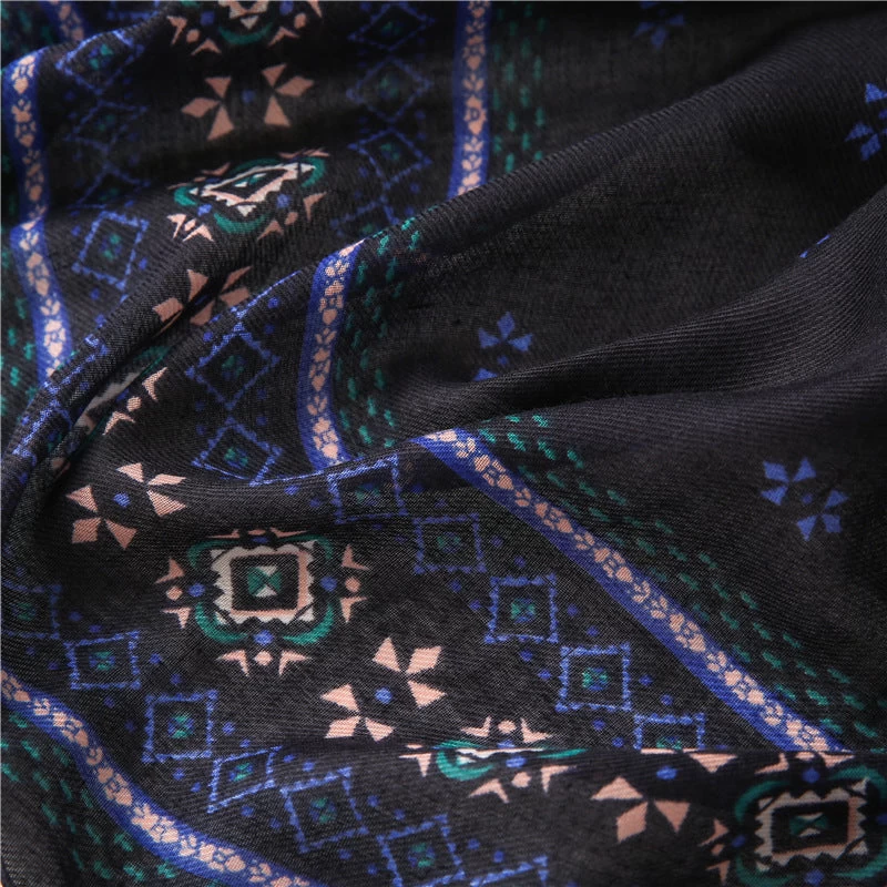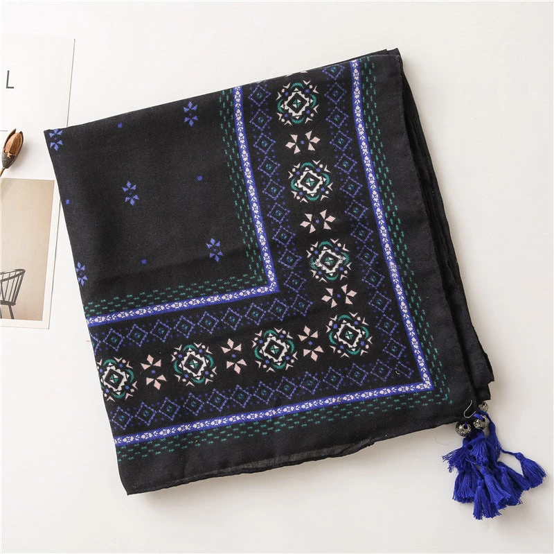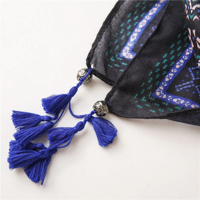 Black Royal Blue Geometric Prints Square Scarf With Beads Tassels