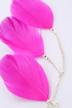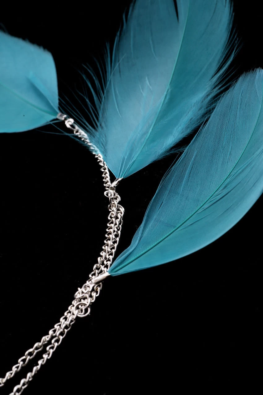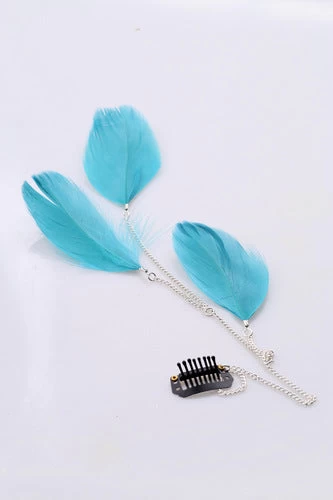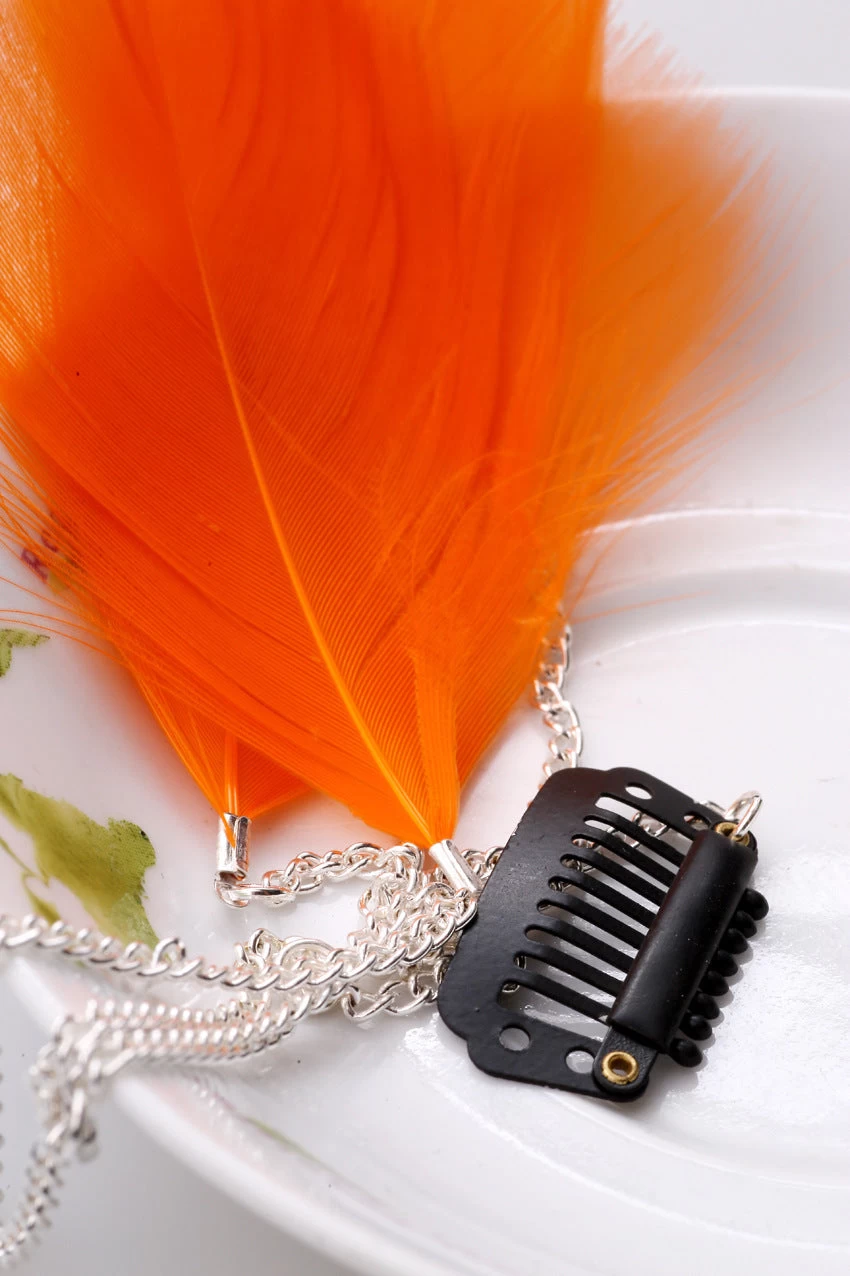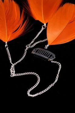 This accessory features eye-catching feathers and a sleek silver chain, adding an elegant touch to any hairstyle. With its versatility and effortless style, our hair clip is perfect for any occasion. Whether you’re looking to add a touch of glamour or simply want to elevate your look, our feather-extension hair clip is the perfect addition to your hair accessory collection.Â