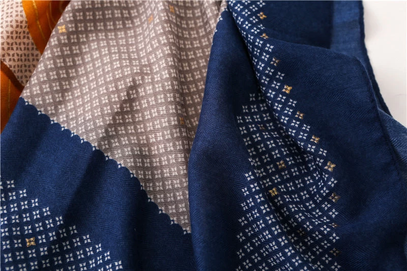 Gold Stamped Orange Yellow Leaves Print Navy Grey Fringed Scarf