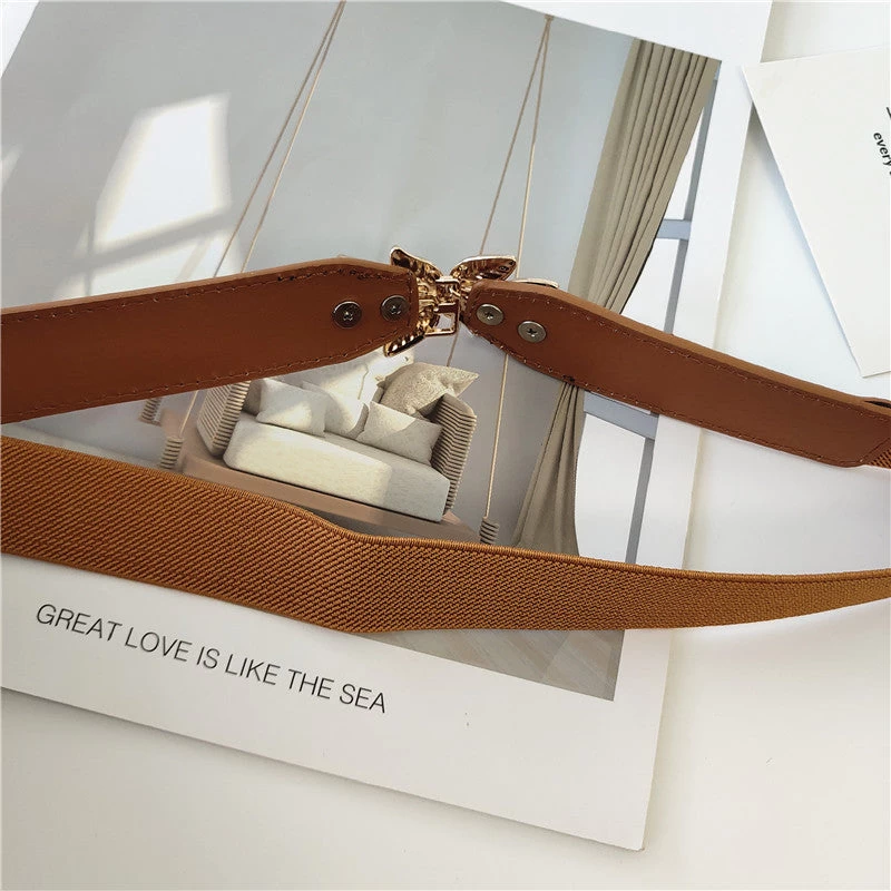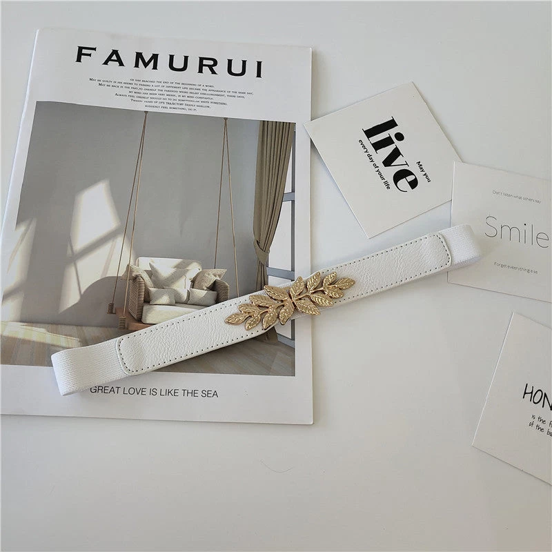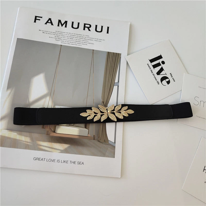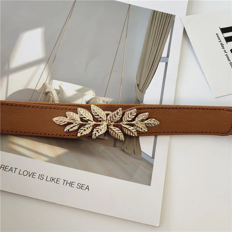 Crafted with soft synthetic leather and a secure metal golden leaves buckle, this 2.5cm x 65cm belt is perfect for any waist size up to 100cm. The stretchable elastic band ensures a comfortable and flattering fit, making it a versatile addition to your wardrobe. Whether dressing up or down, this belt offers a stylish and practical accessory that will elevate any outfit.