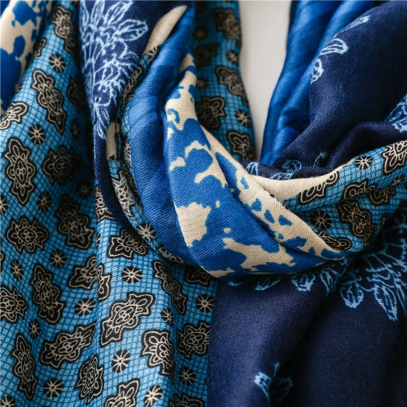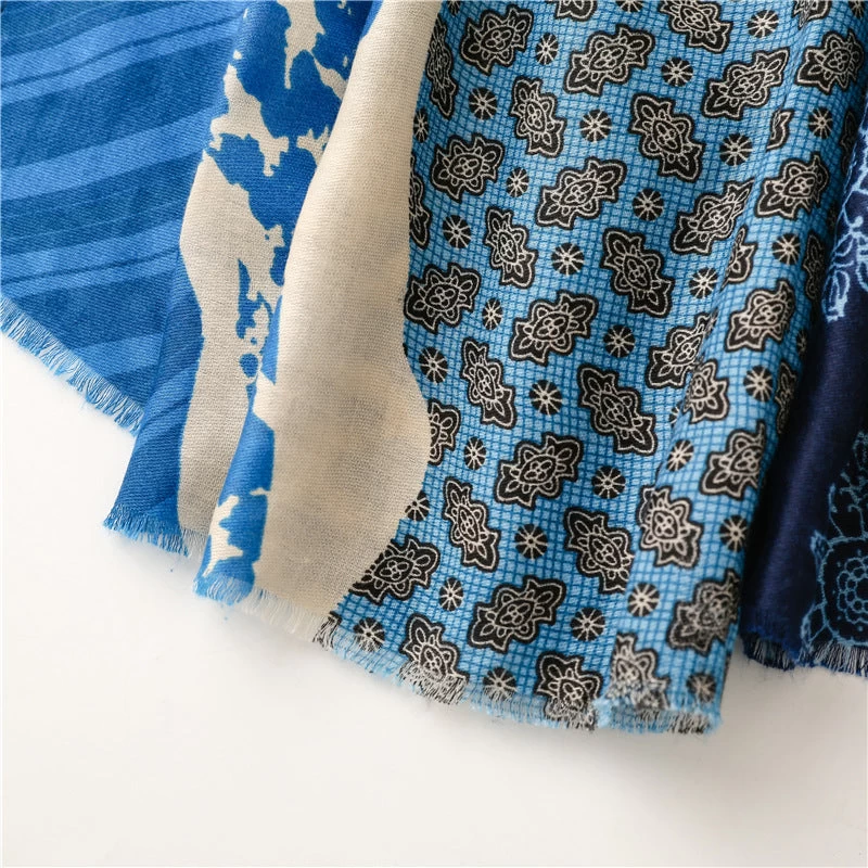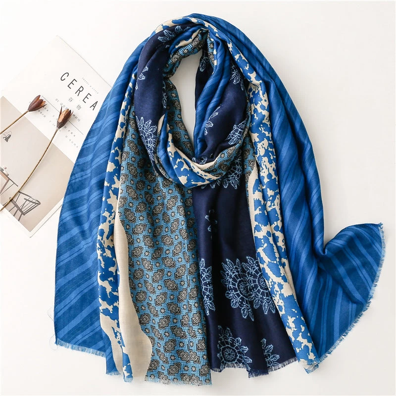 Designed to be both stylish and practical, this multi-patterned long scarf with tassels in blue is the perfect addition to any outfit, regardless of the season. Made with high-quality viscose, this scarf measures 180cm by 85cm, offering both versatility and quality in one must-have accessory.