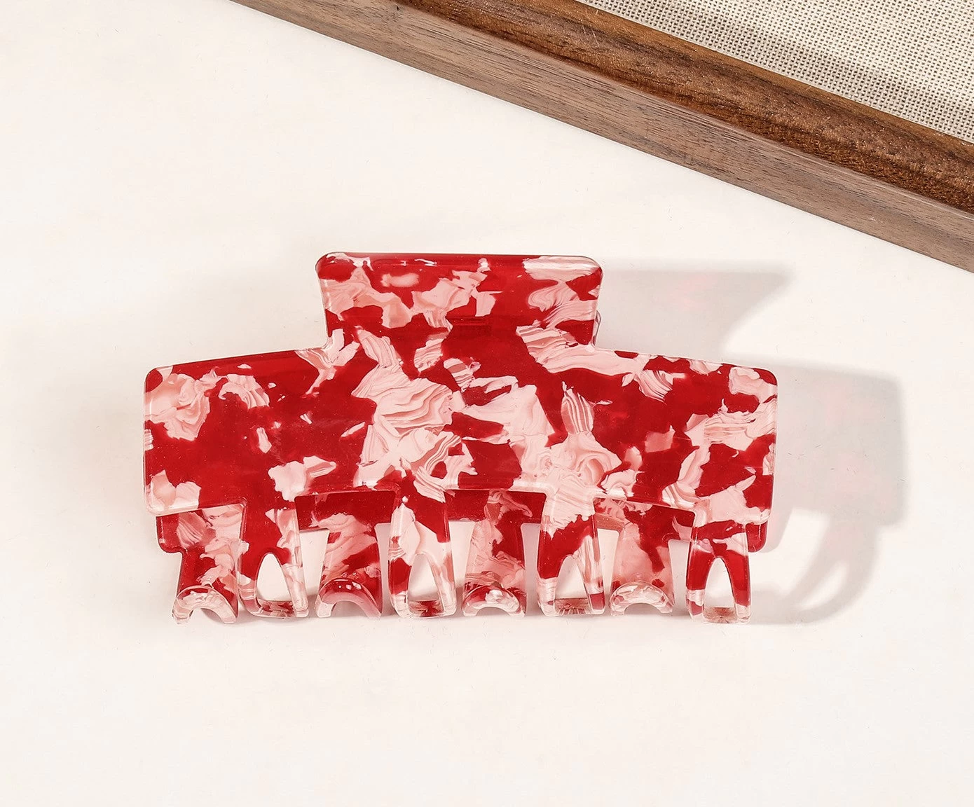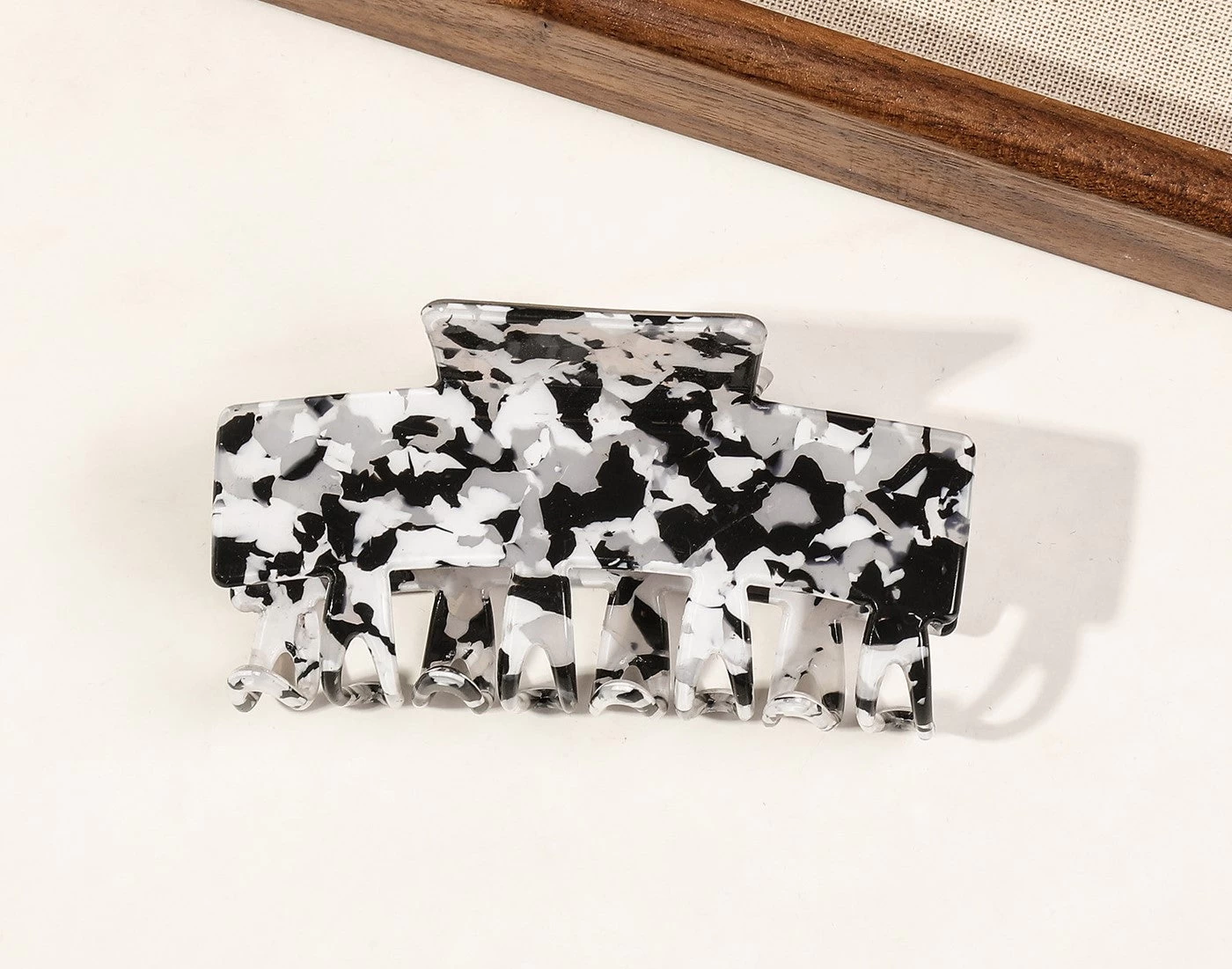 Crafted from smooth acrylic, this hair claw measures 9.5cm in length and 3.5cm in width. It boasts a sturdy jaw that firmly holds hair in place all day long, making it the perfect accessory for medium to thick hair.