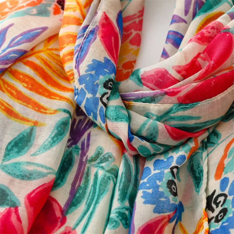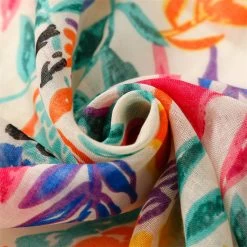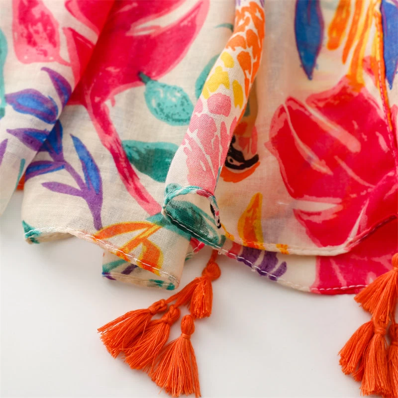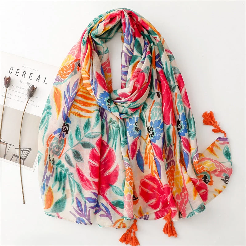 Multicoloured Leaves With Birds Long Scarf With Tassels
