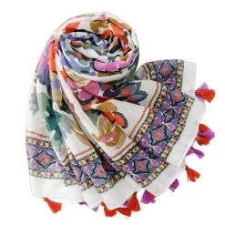White Beige Long Scarf With Tassels With Multicoloured Flowers Print